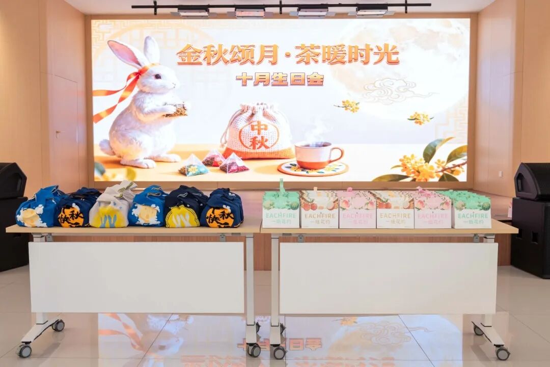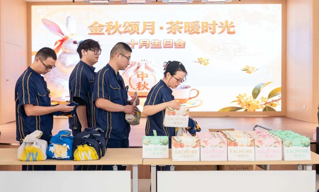 十月的溫柔,藏在金旺生日會的每一處細節里。餐桌中央,金黃的麥穗與橙紅小菊錯落點綴,與暖色調的桌布相映成趣,仿佛將整個秋天的豐饒與絢爛都搬進了室內。大屏幕上,定制海報以秋葉為襯,寫有對所有壽星的祝福——季節的靜美與儀式的莊重,在這一刻巧妙相融。隨著生日歌緩緩響起,承載著甜蜜的定制小蛋糕鋪滿餐臺,寓意著員工與金旺智能共同成長的豐碩成果。為壽星們精心準備的生日禮物已經在一旁擺好,既是 期許 也是 陪伴 。