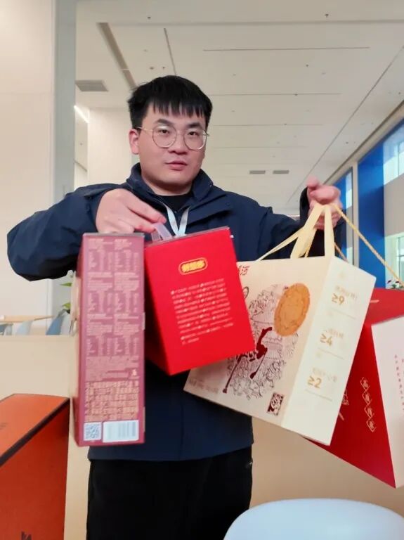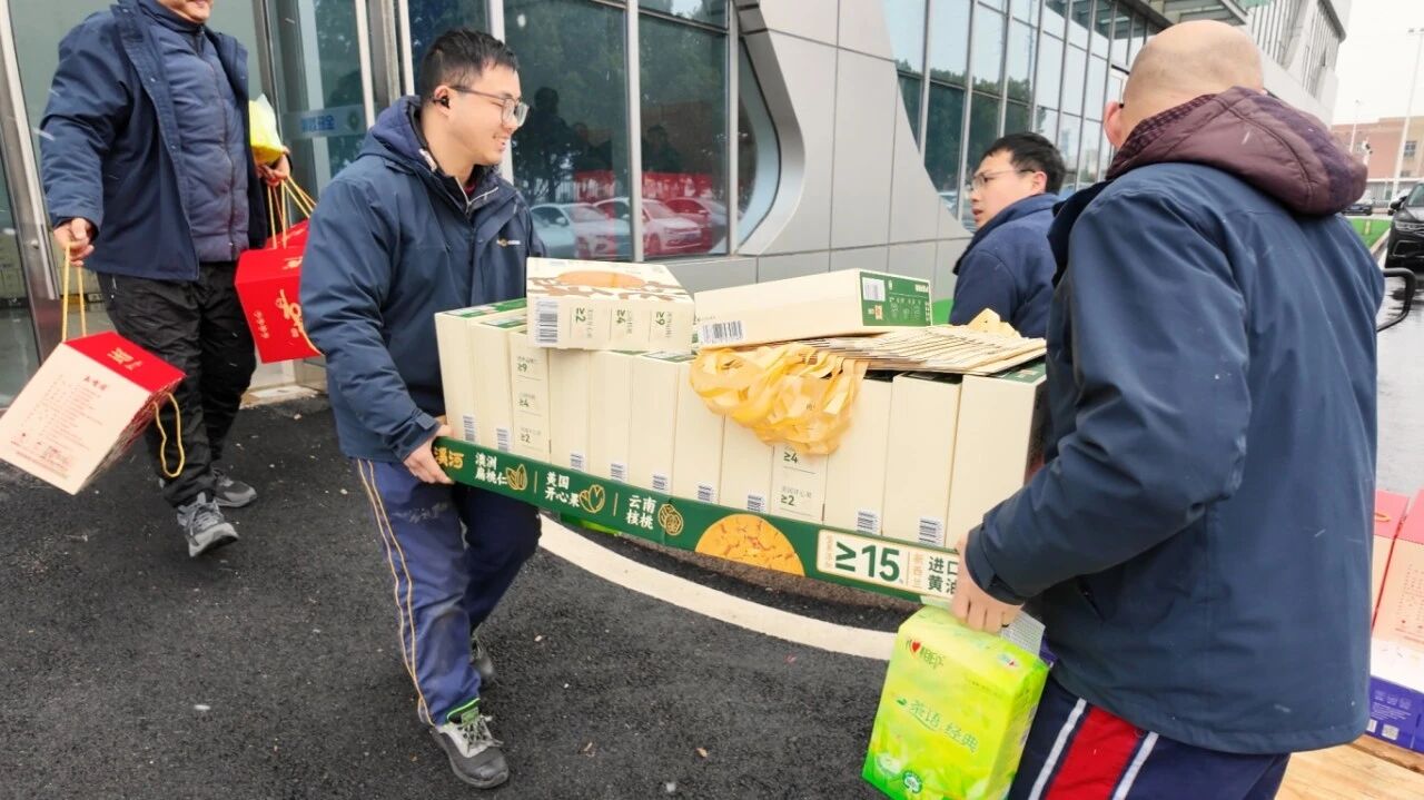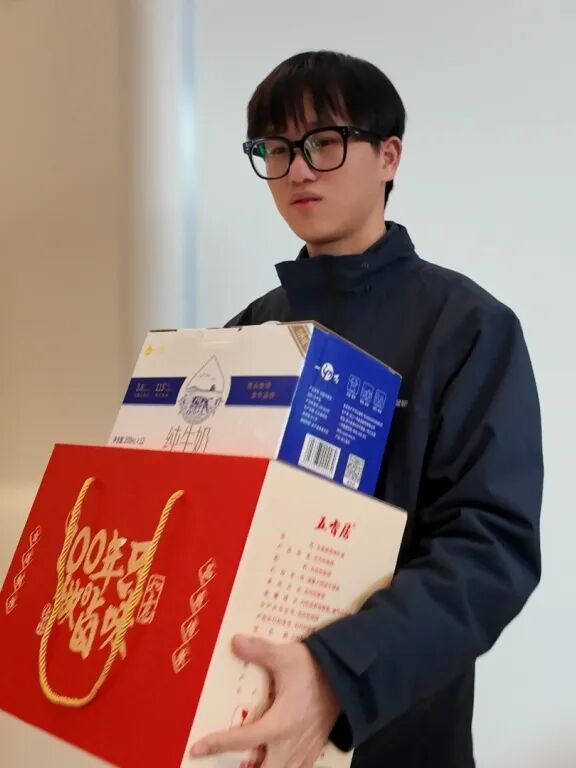 金旺智能的員工們陸續收到了一份沉甸甸的新春禮盒。沒有繁復的儀式,只有樸素的傳遞——牛奶、堅果、水果、瀘溪河桃酥、五香居、好想你棗。