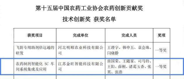 近日,中國農藥工業行業協會公布了第十五屆農藥工業協會技術創新獎獲獎企業名單{中農協(2022)161號},金旺智能“農藥制劑智能化SC車間系統集成及應用”榮獲技術創新獎一等獎。