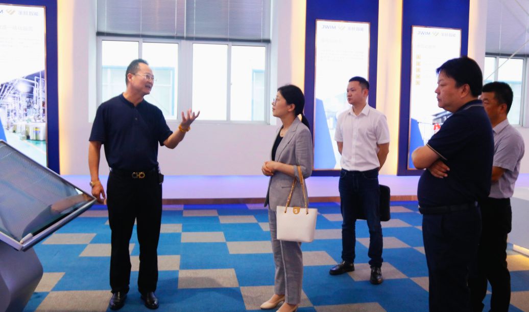 李冬英一行領導對金旺智能樣板車間、文化展廳進行實地參觀,董事長房國榮對企業核心技術、技術團隊、科技成果以及轉化應用情況做了一一介紹。