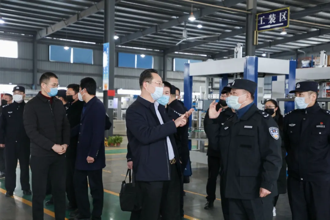 常州市公安局副局長徐衛東帶隊,金壇區人民政府副區長、常州市公安局金壇分局局長王曉航陪同,認真聽取江蘇金旺智能科技有限公司董事長房國榮針對企業疫情防控、技術研發、防疫物資供應等情況匯報,對企業細化疫情防控舉措、助力防疫物資供應予以肯定。
