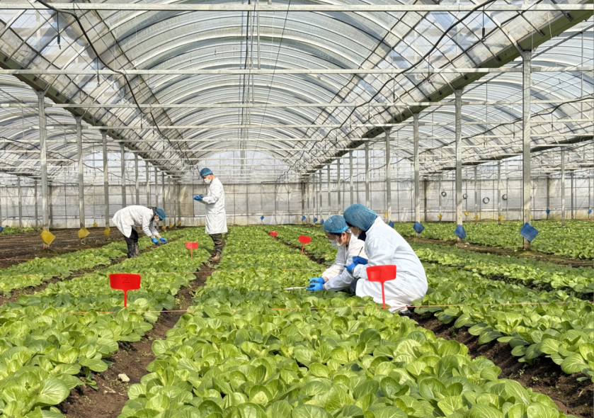 硅羿科技團隊成員在浦東新區試驗田現場測試十字花科蔬菜殺蟲劑的效能
