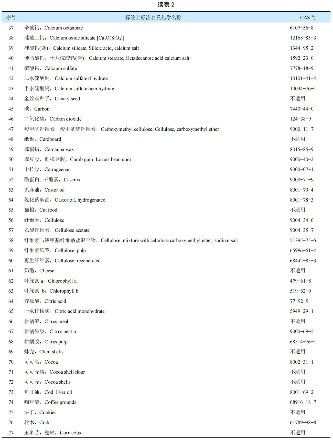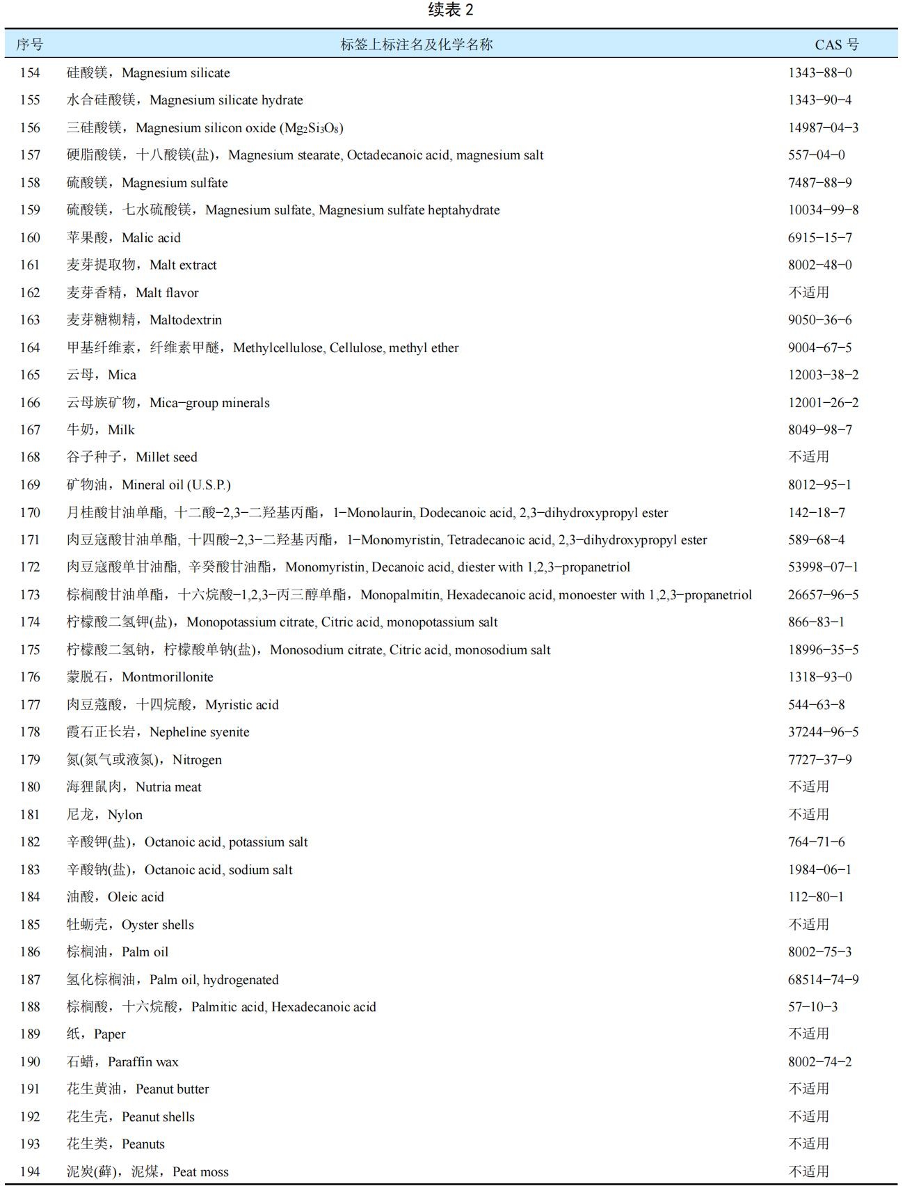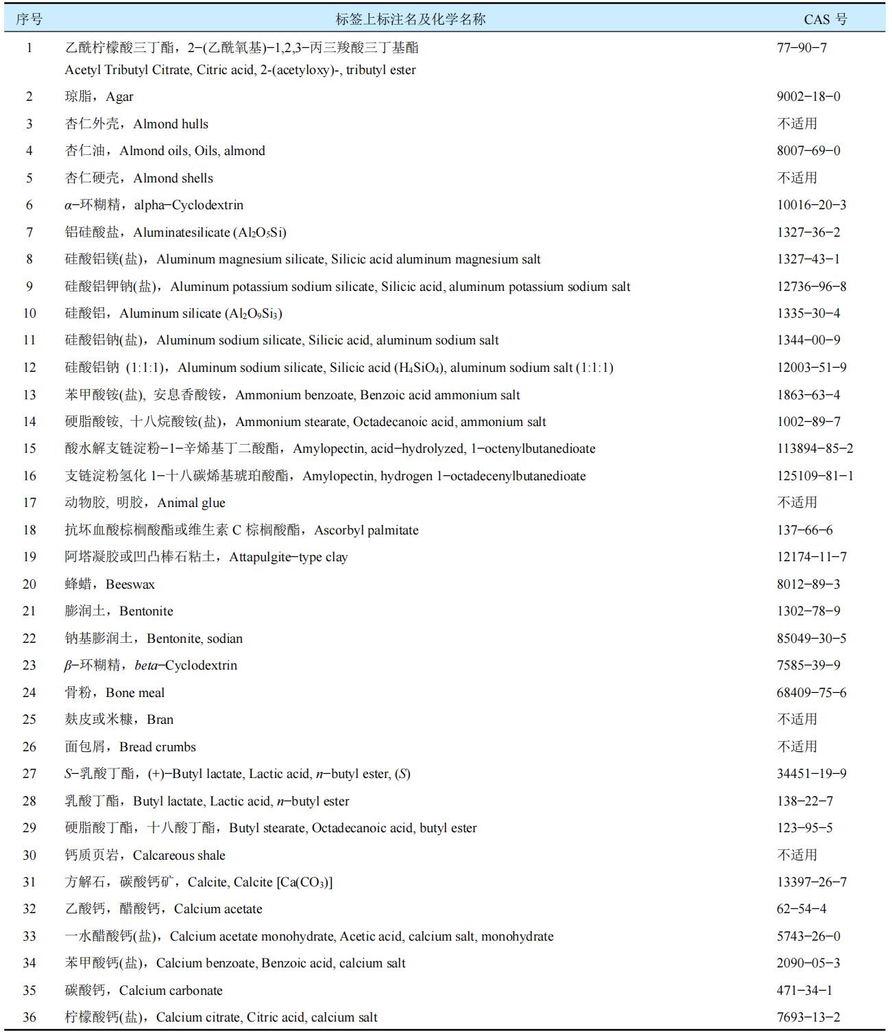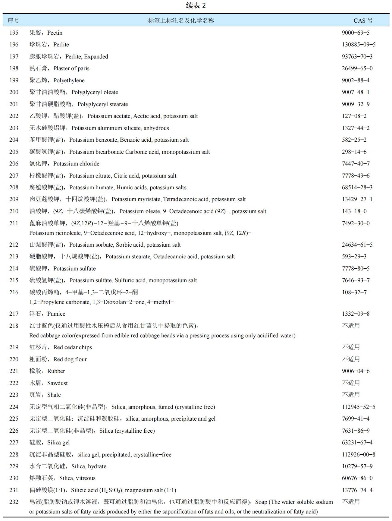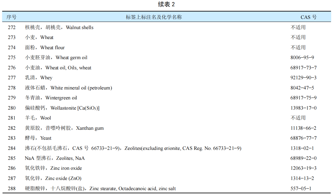 新增加了2個成分,即9號硅酸鋁鉀鈉和202號乙酸鉀;取消3個CAS號重復的成分;增加和修訂部分產品的CAS號,如92號白云石等;淘汰2個沒有CAS號的產品:如蘋果渣Apple pomace和葡萄浮石Grape pumice;對不合適的文字作了修訂;并統一按照標簽上的英文通用名稱字母進行排序。