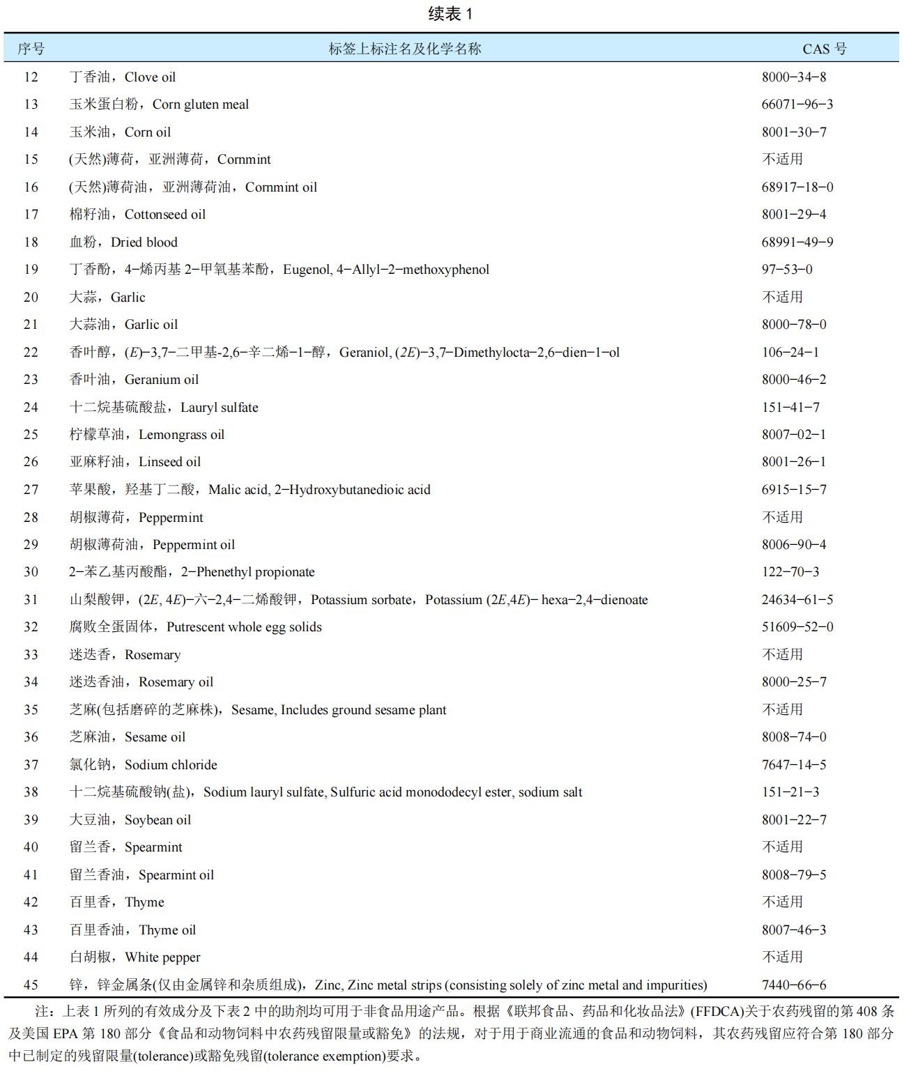 表1  豁免登記最低風險農藥產品中允許使用的有效成分名單