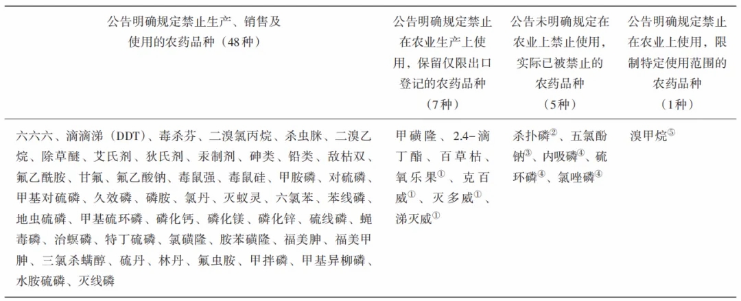 備注:農業農村部第736號公告規定,氧樂果、克百威、滅多威、涕滅威制劑產品自202661日起禁止銷售和使用;農業部第2289號公告規定自2015101日起,撤銷殺撲磷在柑橘樹上的登記,禁止殺撲磷在柑橘樹上使用。由于殺撲磷僅登記在柑橘樹上使用,目前無制劑登記,實際已被禁用;農辦農〔201110 號規定,鑒于五氯酚鈉對環境存在較大風險,衛生系統已停止用于釘螺的防治,建議不再批準新增登記,不批準臨時登記轉正式登記的申請,對現有登記產品不再續展。目前已無制劑產品登記,實質上已被禁用;《高毒農藥淘汰和禁用工作方案》規定全面停止高毒農藥的新增登記和生產許可,內吸磷、硫環磷、氯唑磷屬于高毒農藥,目前已無制劑產品登記,實質已被禁用;農業部第2552號公告規定自201911日起,將含溴甲烷產品的農藥登記使用范圍變更為檢疫熏蒸使用,禁止含溴甲烷產品在農業上使用。