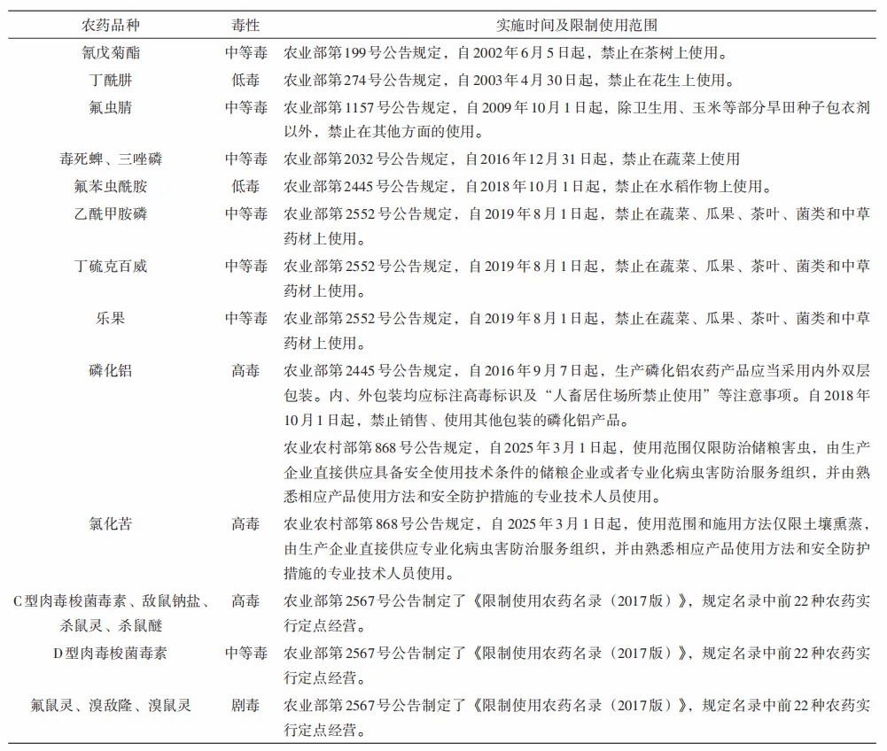 2.2 我國限制使用農藥品種清單 為加強對限制使用農藥的監督管理,保障農產品質量安全和人畜安全,保護農業生產和生態環境,農業部2017年發布第2567號公告制定了《限制使用農藥名錄(2017版)》,規定列入本名錄的農藥,標簽應當標注限制使用字樣,并注明使用的特別限制和特殊要求。據統計,我國目前限制使用農藥有19種(表2,包括劇毒、高毒農藥9種,均在《限制使用農藥名錄》(2017版)中。其中高毒農藥磷化鋁、氯化苦2個品種,因市場需求大,替代產品、替代技術不成熟,專業化用藥安全基本可控等因素,2024年農業農村部發布第868號公告,除規定限制使用范圍以外,為保護使用者安全,同時規定由生產企業直接供應具備安全使用技術條件的儲糧企業或專業化病蟲害防治服務組織,由熟悉相應產品使用方法和安全防護措施的專業技術人員使用。