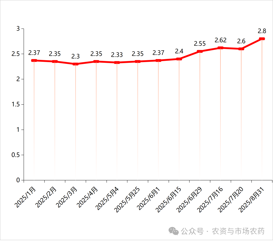 圖1 截至2025年8月31日國內草甘膦原藥價格走勢(單位:萬元/噸)