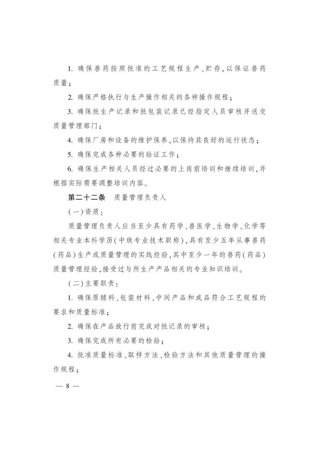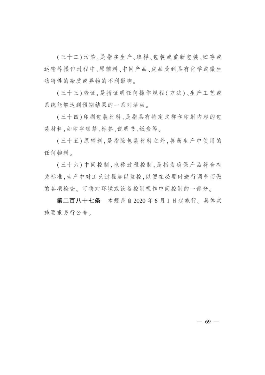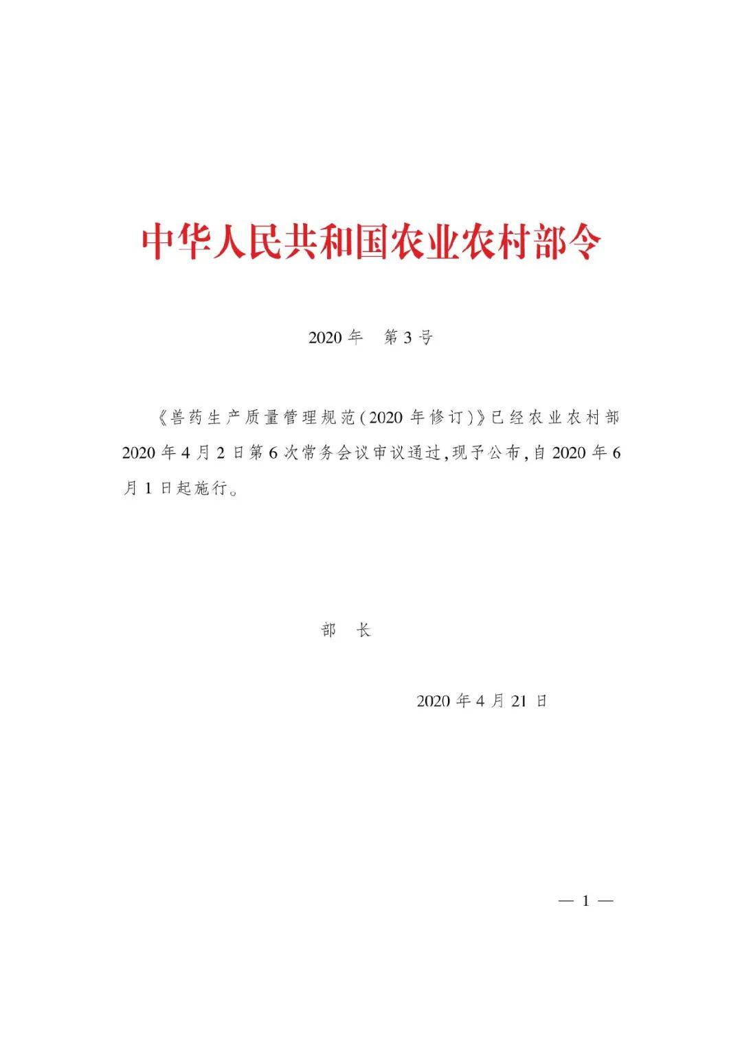 根據《獸藥生產質量管理規范(2020年修訂)》第二百八十五條規定,現發布無菌獸藥、非無菌獸藥、獸用生物制品、原料藥、中藥制劑等5類獸藥生產質量管理的特殊要求,作為《獸藥生產質量管理規范(2020年修訂)》配套文件,自2020年6月1日起施行。