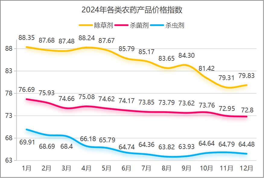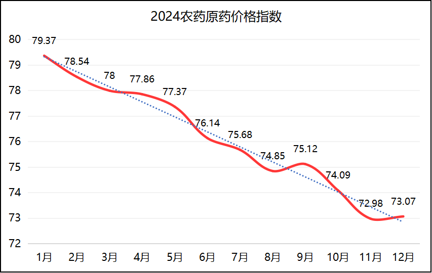 四季度,雖然已至下游“冬儲”時間節點,但受多重因素影響,下游備貨積極性不高,國內農藥市場進入“休整期”,需求相對低迷,外貿需求也偏弱。截至2024年12月底,原藥價格指數報73.07點,同比下跌9.78%,65%的產品價格下跌。全年來看,農藥市場受季節變化、環保政策、國際形勢等多重因素影響,價格波動大,供需關系緊張,市場交投活躍度與價格走勢隨季節及需求變化而波動。