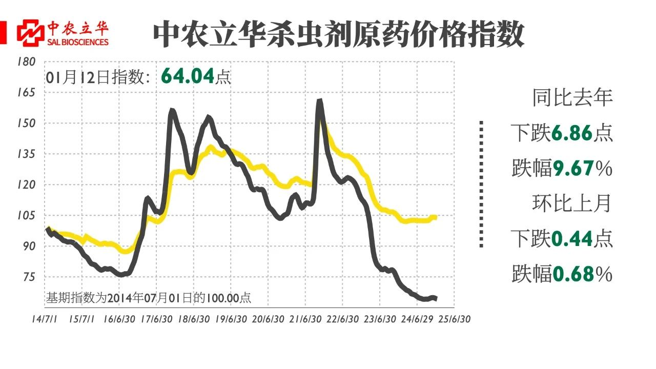 2025年1月12日,中農立華殺蟲劑原藥價格指數報64.04點,同比去年下跌9.67%,環比上月下跌0.68%。
