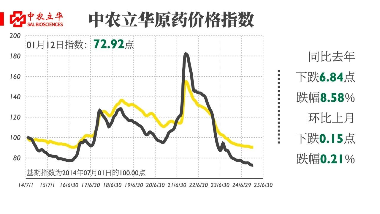 2025年1月12日,中農立華原藥價格指數報72.92點,同比去年下跌8.58%,環比上月下跌0.21%。跟蹤的上百個產品中,同比去年63%產品下跌;環比上月85%產品持平,2%產品上漲。
