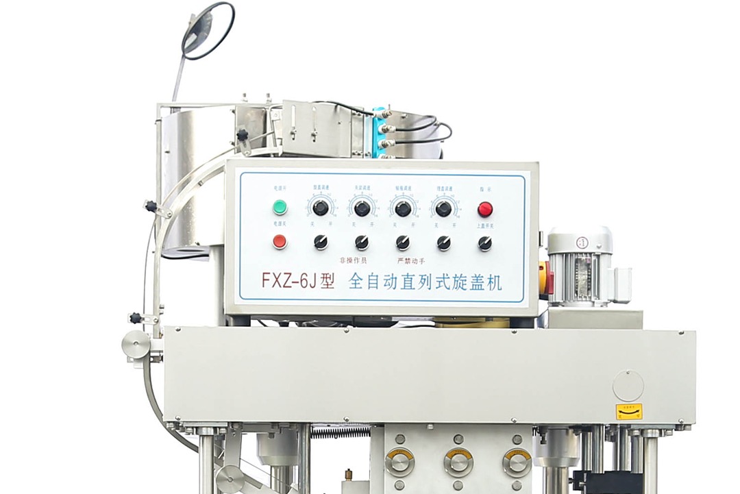 FXZ-6直列式旋蓋機結構簡單,操作方便,它采用搓蓋的方式調節各部位的配合來達到旋蓋的效果。由上蓋、理蓋、反蓋剔除、入滑蓋槽刮蓋、旋蓋、循環進瓶的基本運作順序進行。