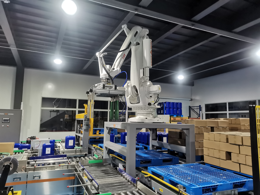 2020年, 金旺研發了一款全新的智能"KZJ-2AH機械臂裝箱機", 該設備將產線上的瓶子由機械臂抓取放入箱子內實現全過程自動包裝。基于金旺十幾年的農牧二次包裝的技術沉淀,可根本上保障并實現抓取系統技術的應用。該設備在硬件上配備了自主研發的連桿機械臂,在軟件上運用了歐美先進的運動控制器系統,同時采用了原裝進口氣脹抓瓶器,使得整個動作流暢,運行準確。