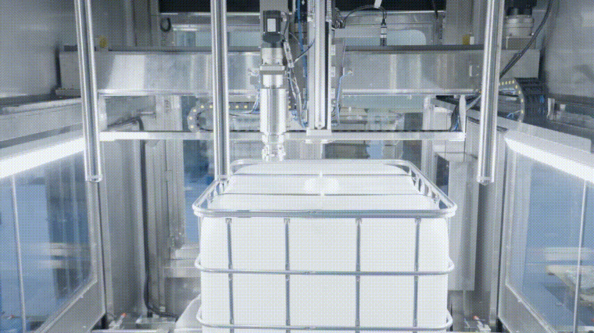 單桶或一托盤四桶進入灌裝工位,通過工業(yè)相機進行尋口卸蓋、灌裝、旋 蓋。